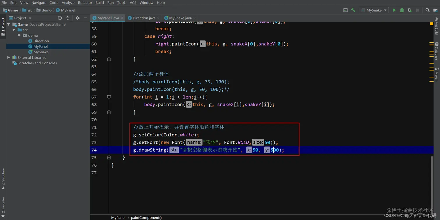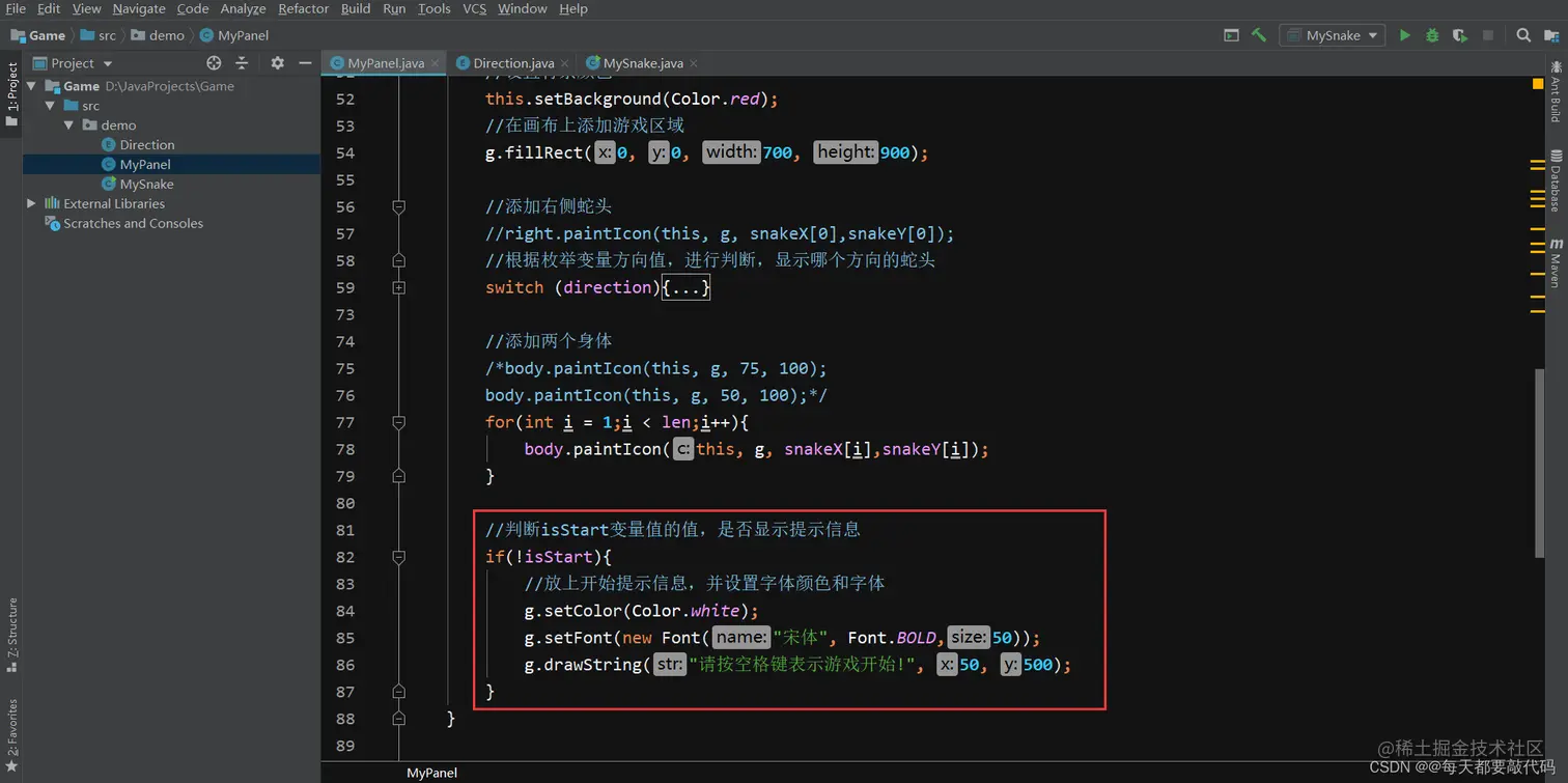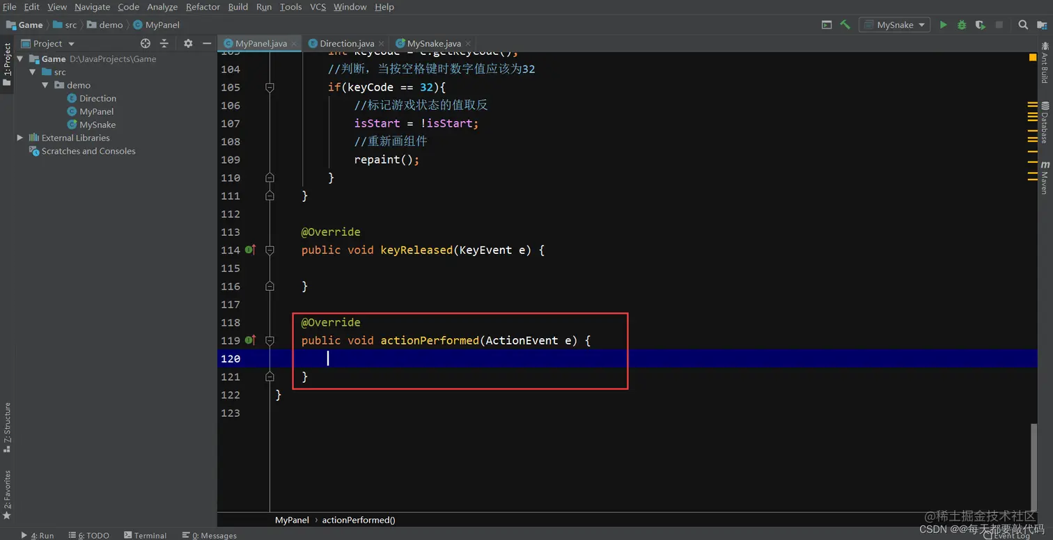 ④获取键盘事件后谁来监听,添加监听this.addKeyListener(this);其中this代表自身,但是目前还没有处理监听事件;则需要在MyPanel类实现KeyListener接口,并且重写三个方法,分别是:keyTyped()、keyPressed()、keyReleased()在keyPressed()方法或keyReleased()方法中都可以实现其中参数keyEvent表示按了哪个键,按不同的键获取不同的数字,则通过e.getKeyCode()获取当前按键对应的数字,然后判断,如果按的是空格键或者数字32,则将当前标记isStart值取反,同时没有开始游戏的提示信息,需要调用repaint()方法,表示重新画组件。