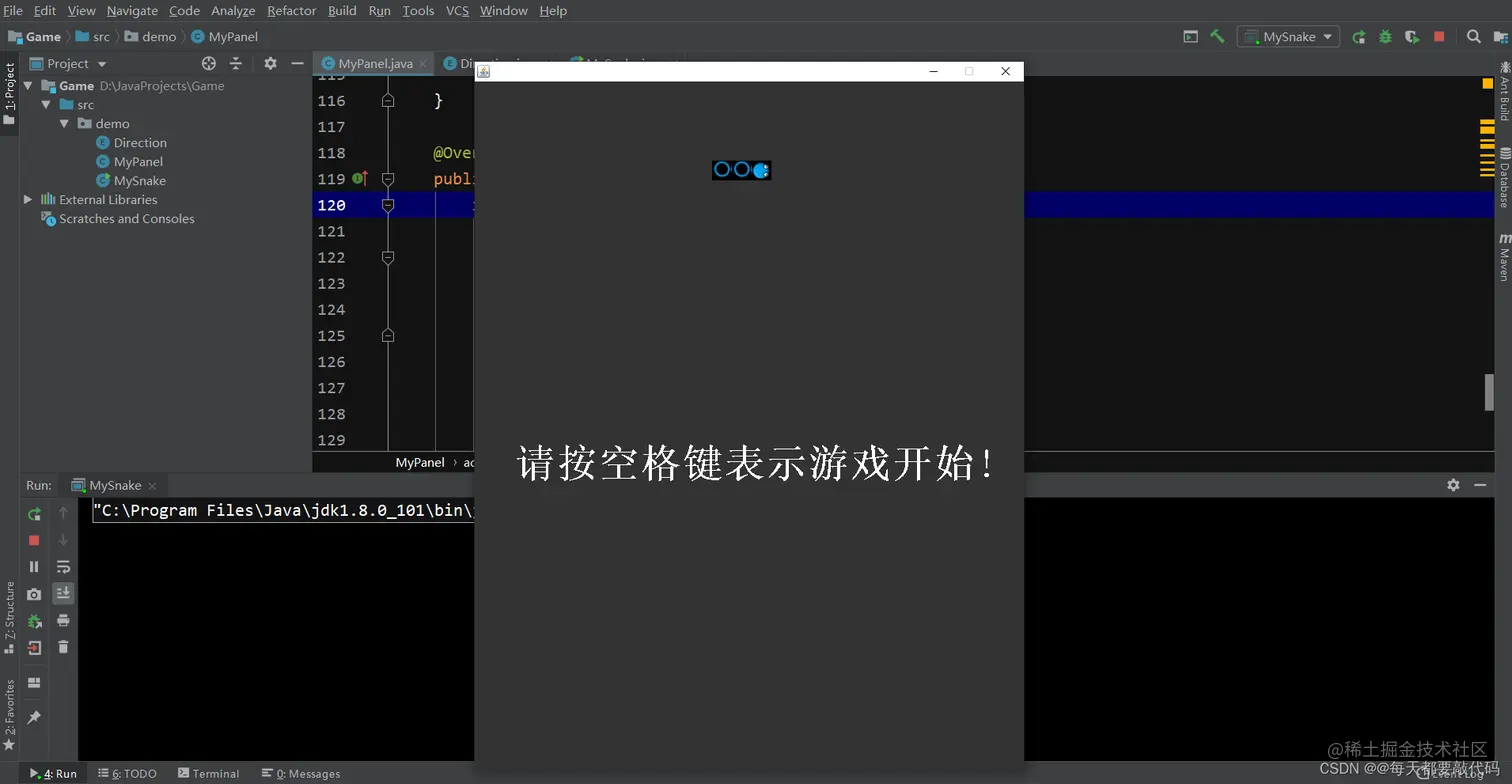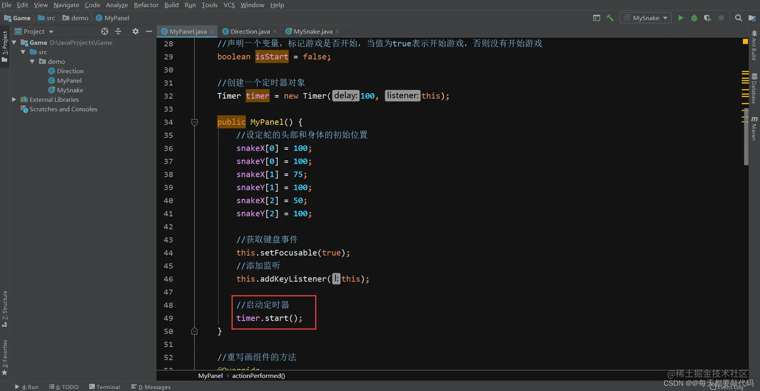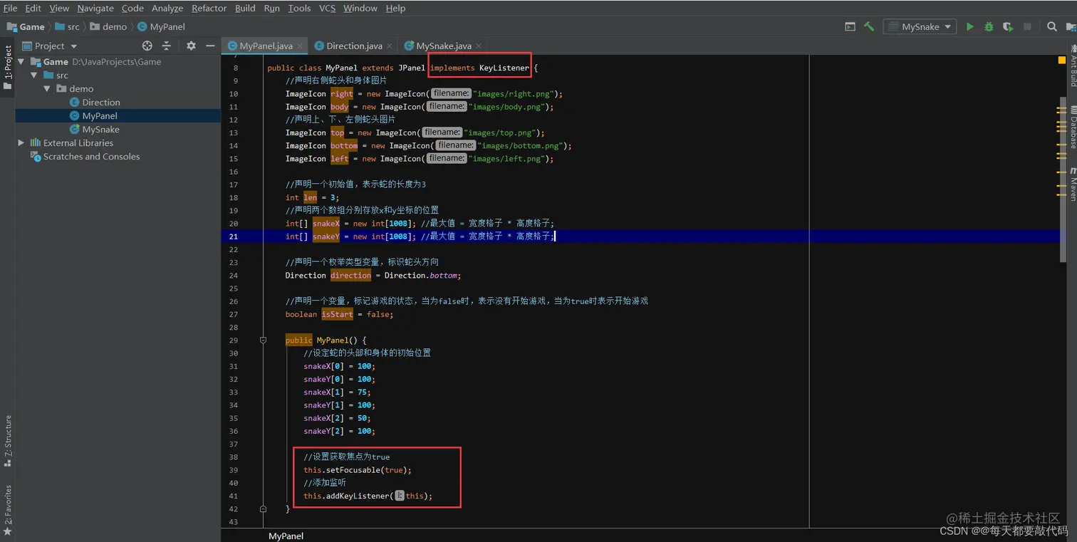 ④获取键盘事件后谁来监听,添加监听this.addKeyListener(this);其中this代表自身,但是目前还没有处理监听事件;则需要在MyPanel类实现KeyListener接口,并且重写三个方法,分别是:keyTyped()、keyPressed()、keyReleased()在keyPressed()方法或keyReleased()方法中都可以实现其中参数keyEvent表示按了哪个键,按不同的键获取不同的数字,则通过e.getKeyCode()获取当前按键对应的数字,然后判断,如果按的是空格键或者数字32,则将当前标记isStart值取反,同时没有开始游戏的提示信息,需要调用repaint()方法,表示重新画组件。