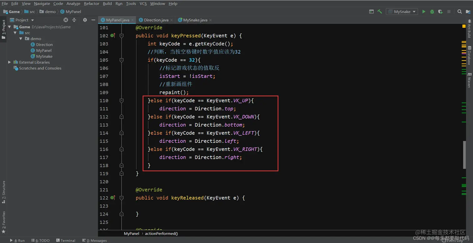 } else if (keyCode == KeyEvent.VK_UP) { // 改变蛇头的方向
