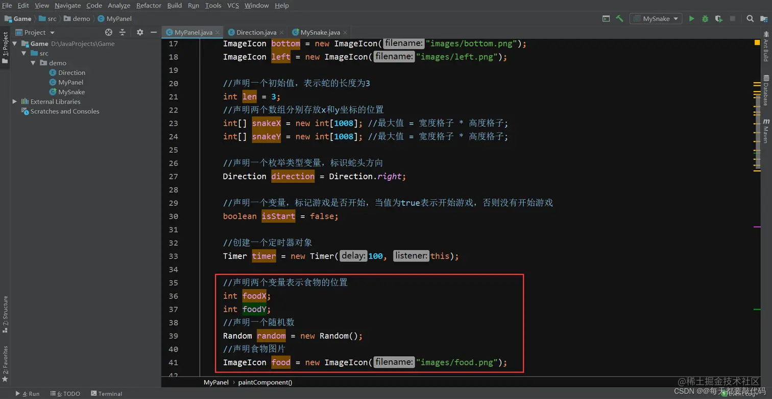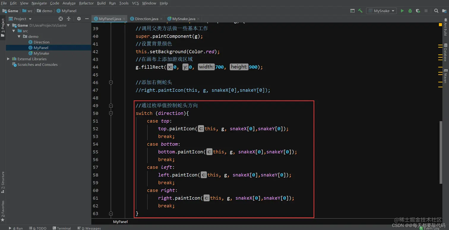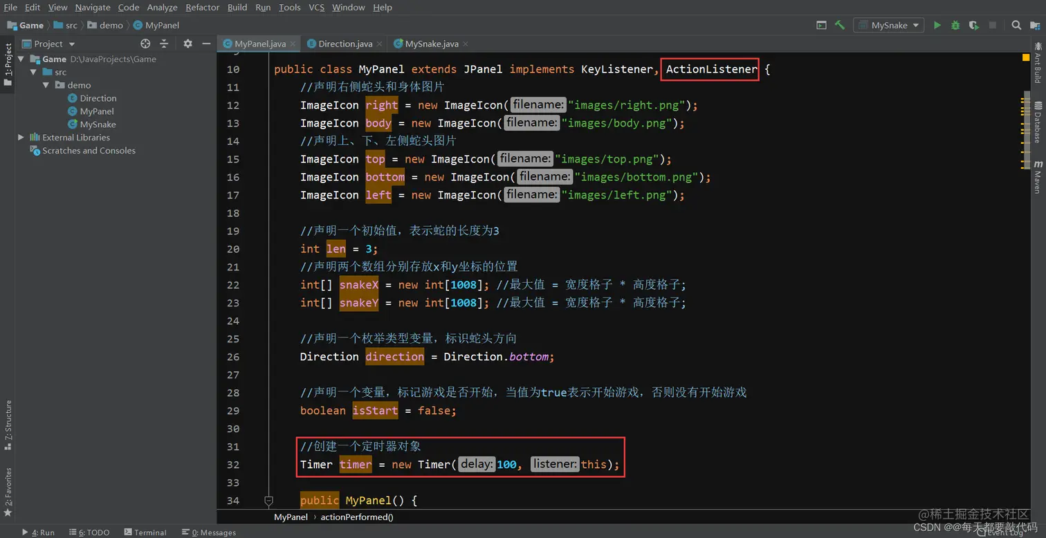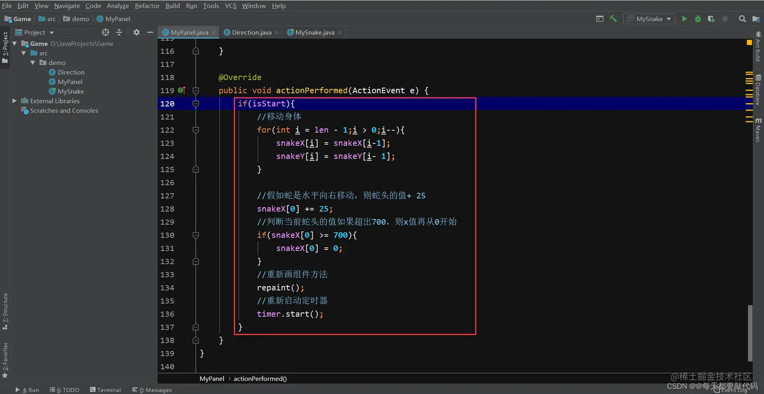 ③在重写actionPerformed()方法体中,实现蛇移动;移动蛇的思路: