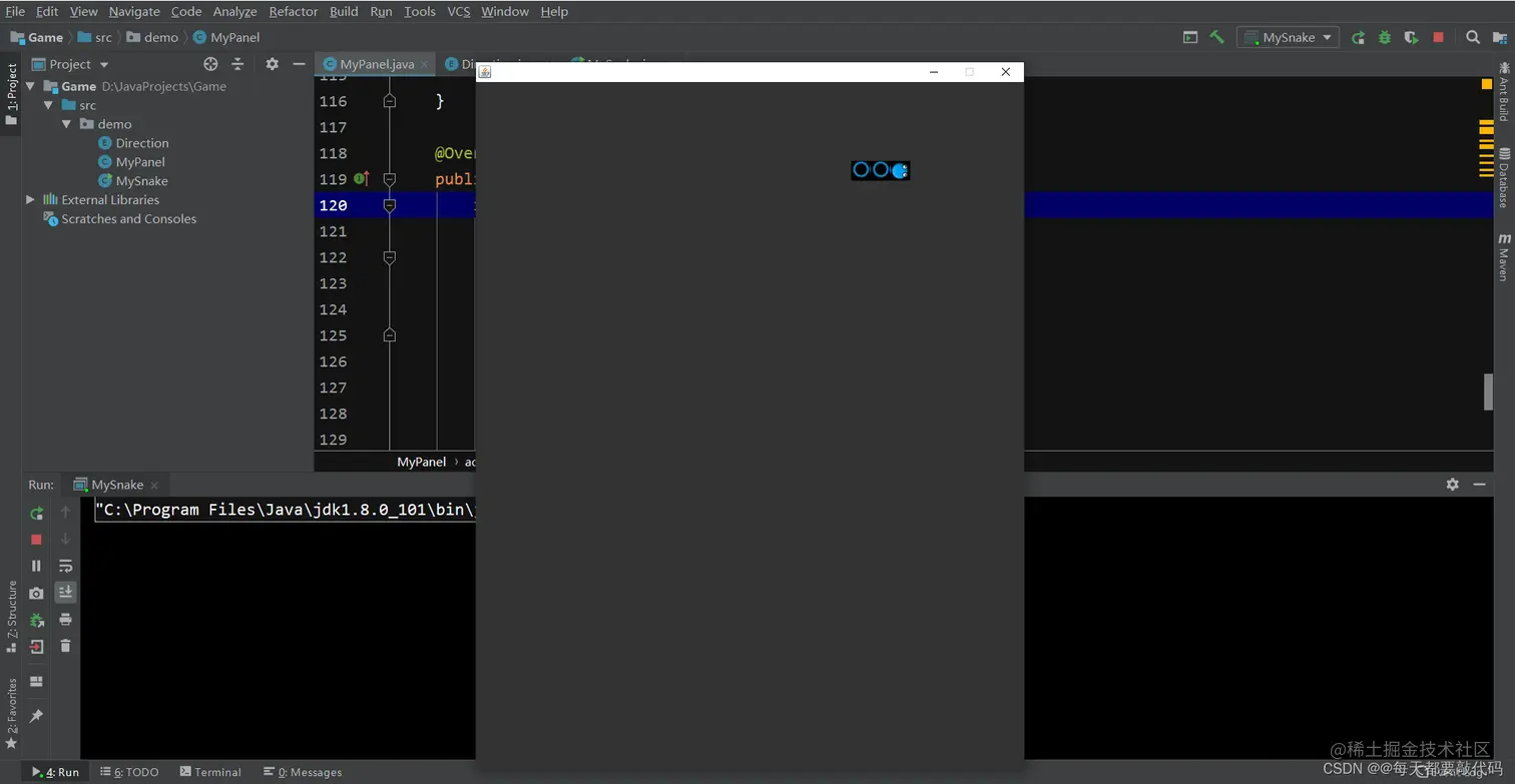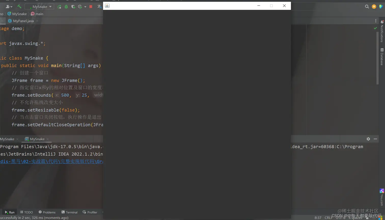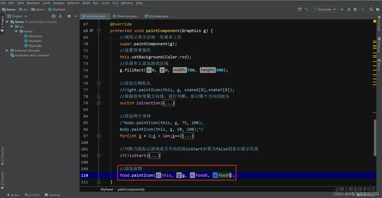 ③在重写actionPerformed()方法体中,实现蛇移动;移动蛇的思路: