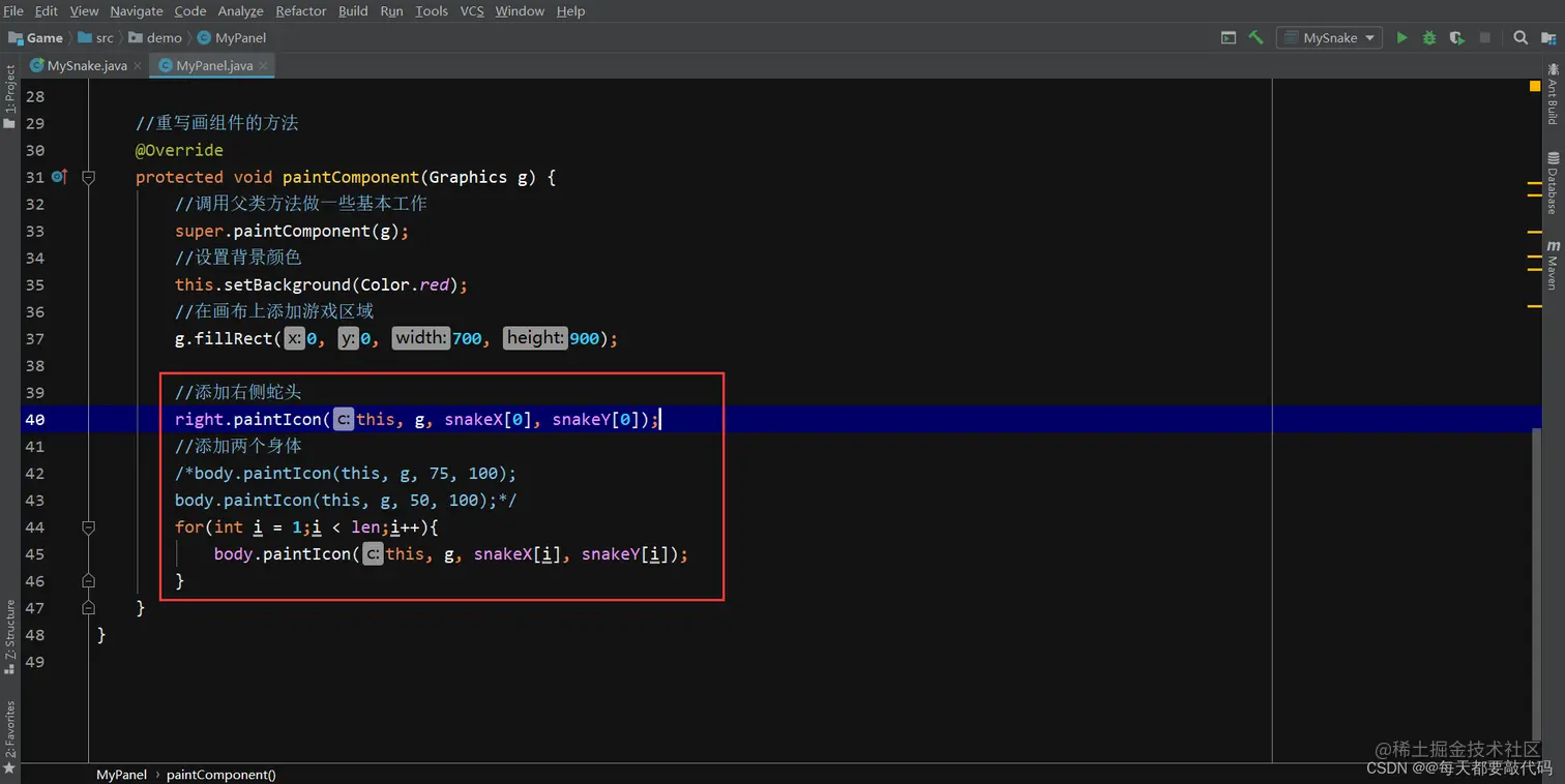 top.paintIcon(this, g, snakeX[0], snakeY[0]);