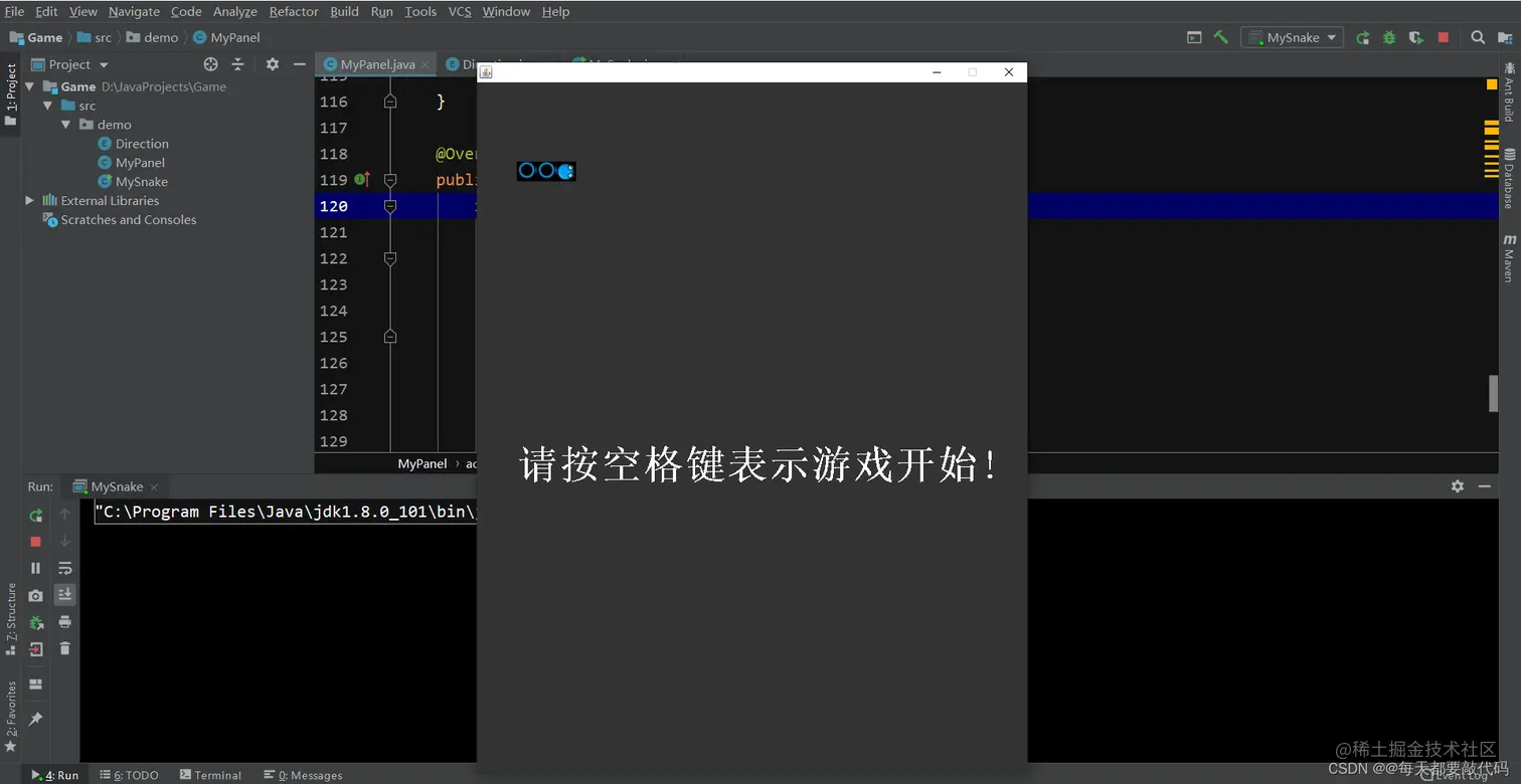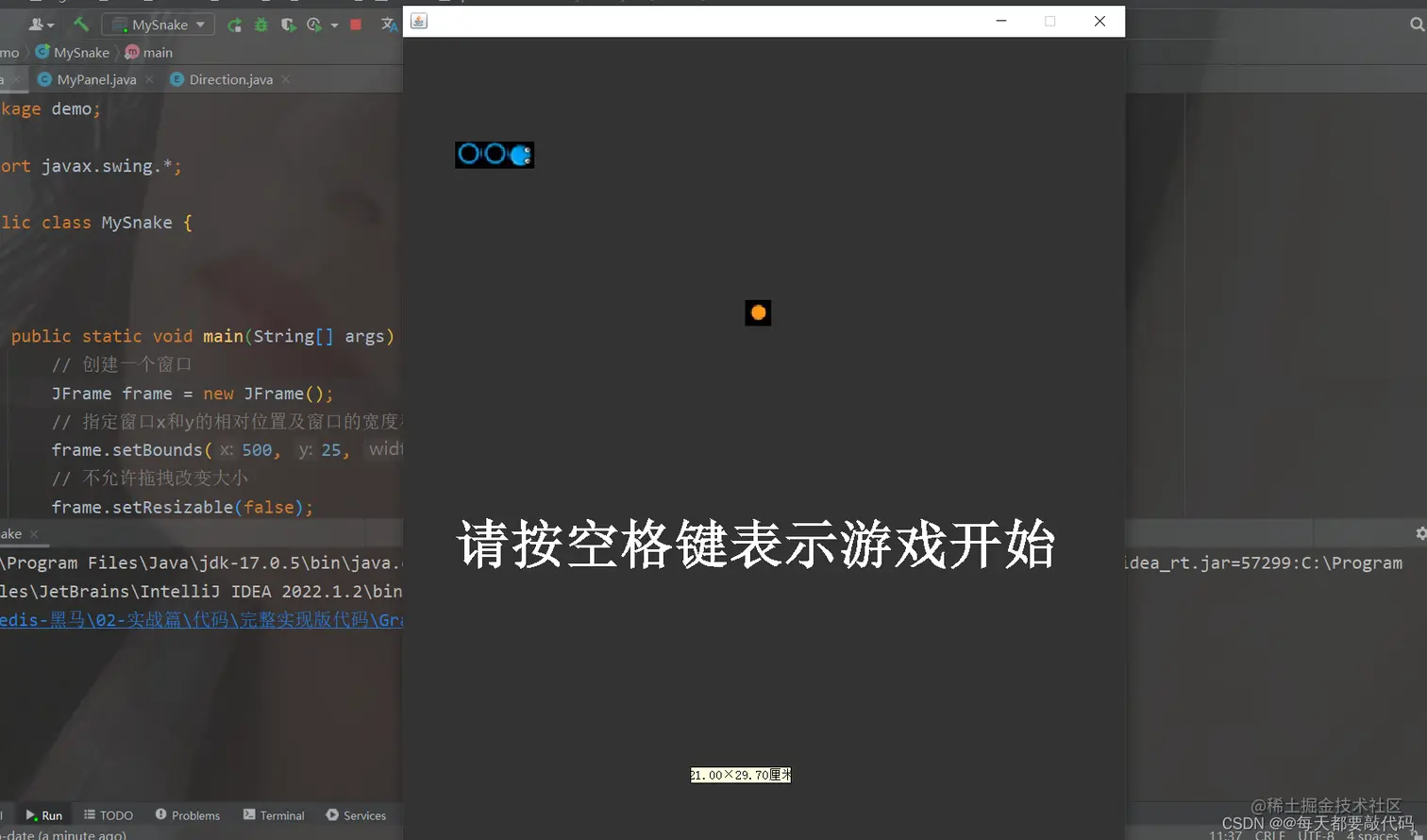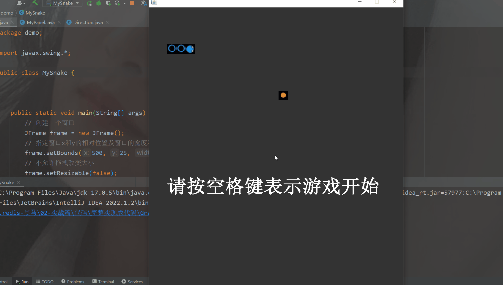 当按空格键时,提示信息不显示同时蛇开始水平向右移动,运行效果如下