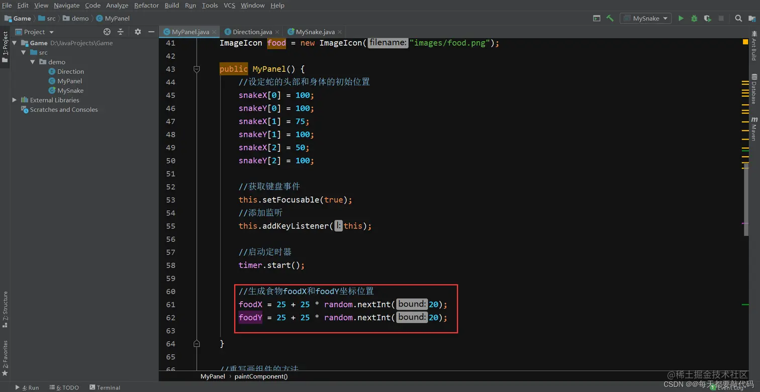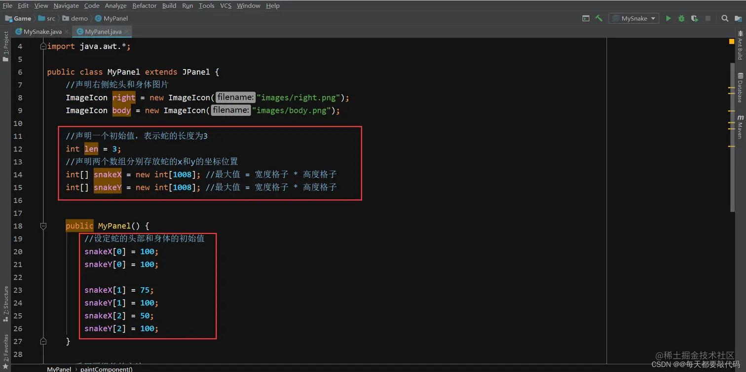 ②声明蛇的x坐标和y坐标,当创建对象执行无参构造方法时,完成蛇的右侧头部和身体位置初始化,此时就不需要之前编写静态蛇身体的代码,通过编写循环遍历数组即可。