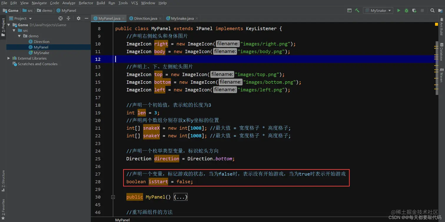 ①声明一个boolean类型变量isStart为false标记游戏的状态。