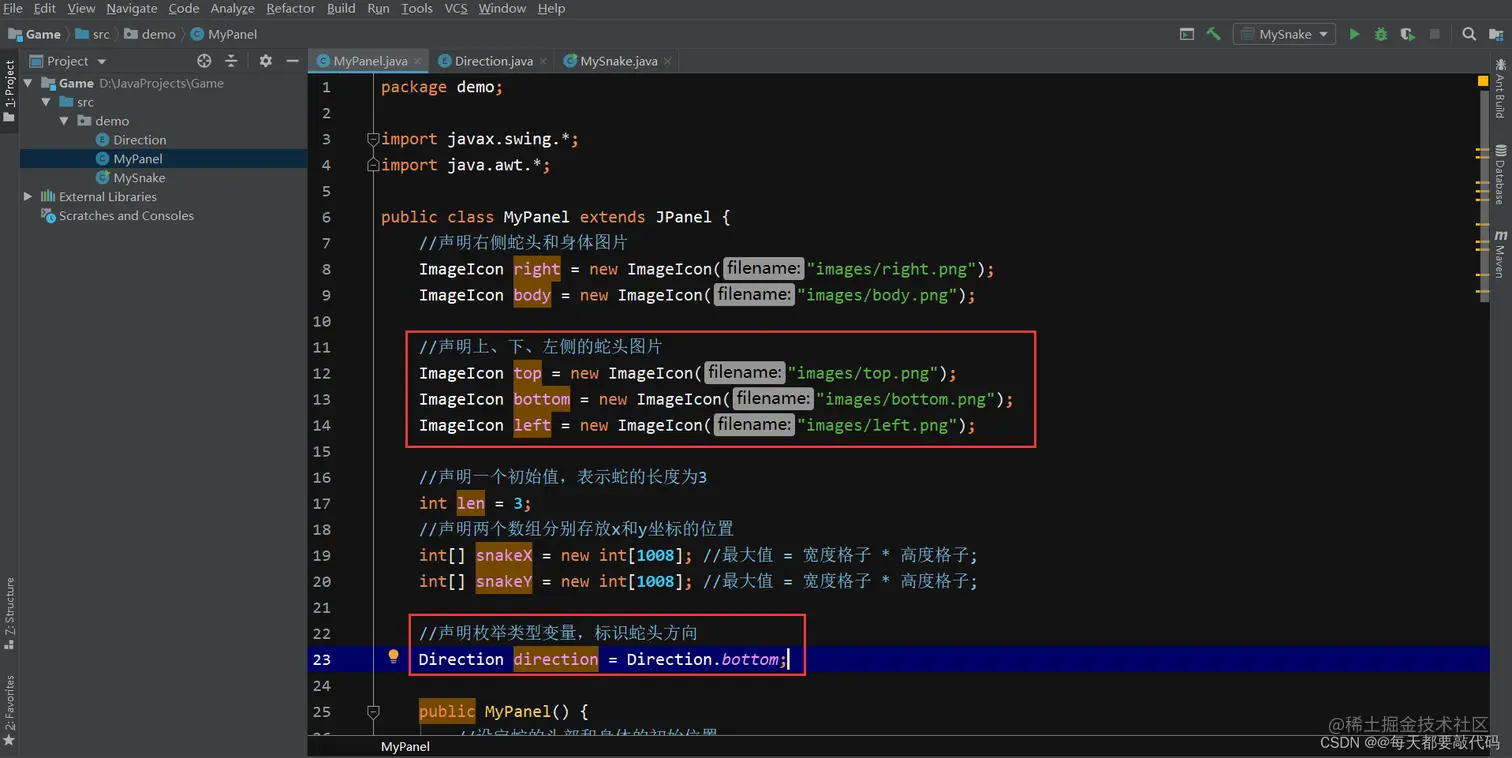 ①定义一个枚举方向,有上、下、左、右四个取值,分别声明向上、向下和向左的三个蛇头图片。