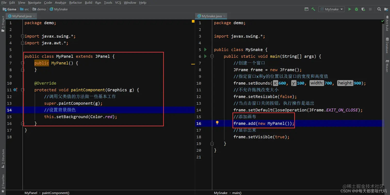 ①新建一个类MyPanel画布,同时继承JPanel。编写两个方法:无参构造方法和重写画组件,其中参数看作是一个画笔。