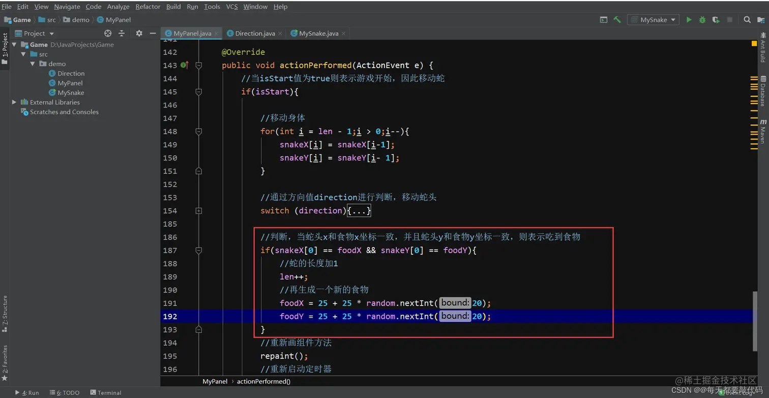 在重写的actionPerformed()方法体中,实现蛇移动逻辑