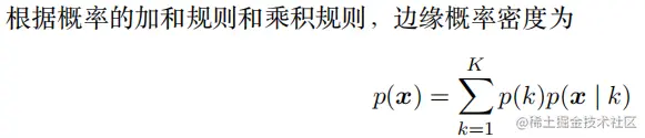 可把πk = p(k)看成选择第k个成分的先验概率, 把 密度N (x | µk, Σk) = p(x | k)看成以k为条件的x的概率。