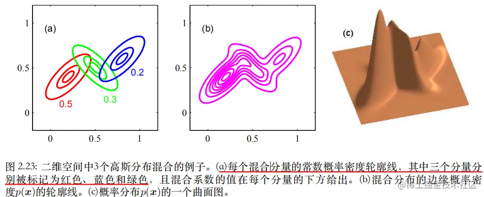 混合⾼斯(mixture of Gaussians),每⼀个⾼斯概率密度N (x | µk, Σk)被称为混合分布的⼀个成分(component),并且有⾃⼰的均值µk和协⽅差Σk。