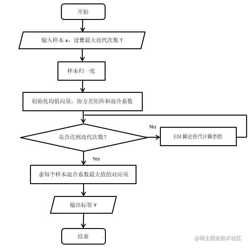 当成分为多元高斯分布时(d维),相当于从混合多元高斯分布中生成了样本,通过EM算法迭代地学习模型参数(均值和方差以及混合系数)。