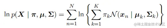 {µ1, . . . , µK}且Σ ≡ {Σ1, . . . , Σk}。⼀种确定这些参数值的⽅法是使⽤最⼤似然法。根据公式),对数似然函数为: