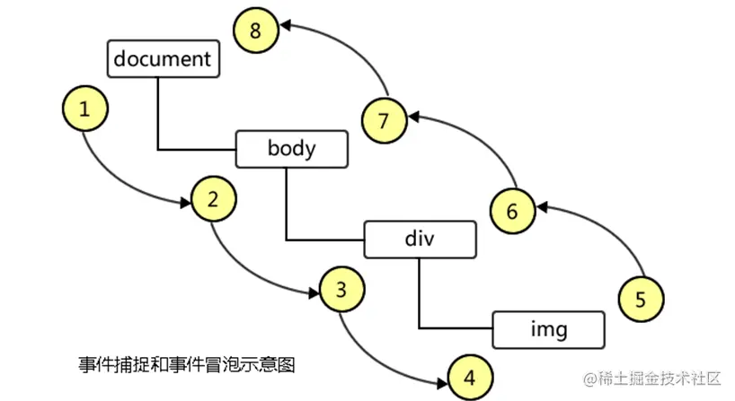 向下是捕获1-2-3-4,向上是冒泡5-6-7-8
