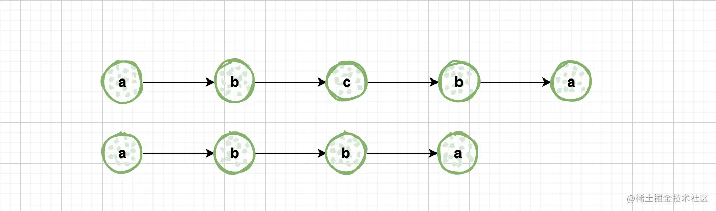 以单链表来说,如图,图中的单链表就属于回文结构: