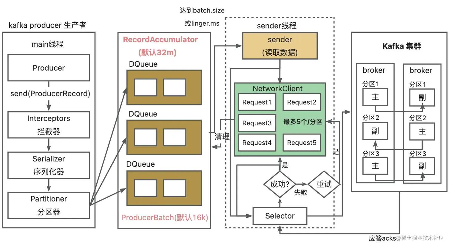 batch.size:只有数据累计到batch.size后,sender才会发送数据。默认16klinger.ms:如果迟迟没有达到batch.size,sender等待linger.ms设置时间之后,发送数据。单位:ms,默认0(没有延迟)acks设置: