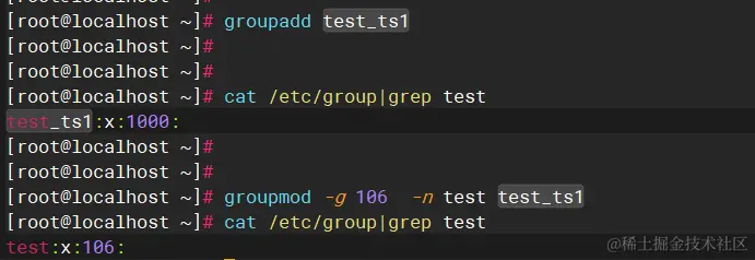 $groupmod -g 106 -n test test_ts1