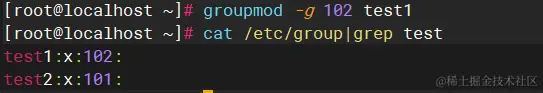 $groupmod -g 102 test1