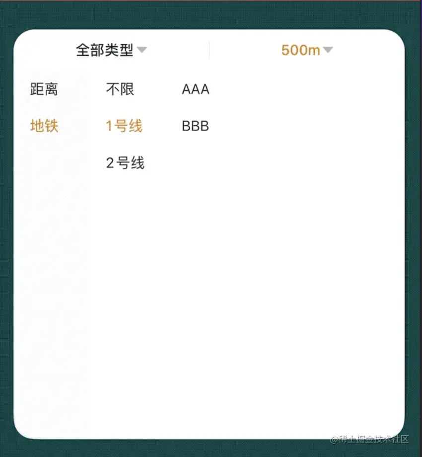关于回显的处理,需要注意的是,回显的时候不需要用到前一个选中的索引,只需要用户最后确认时的索引即可。 另一个可能引起很多问题的地方是,一定要注意对于重置选中cell的触发条件,在我的需求中,有几种情况会触发重置cell,分别是:选中第三个列表、触摸背景区域让菜单栏消失、点击全部类型按钮、点击距离/地铁按钮,这四种情况都要重置用户上一个选中时的索引,这对于处理回显有很大的影响,其中只有用户选择具体距离(比如1KM)或选择地铁-不限或某一个地铁站时,我才应该记录当前用户的选项,否则类似于点击背景区域让菜单栏消失,不应该再去记录当前用户的选择,用户的选择应该还是停留在之前的选中状态。