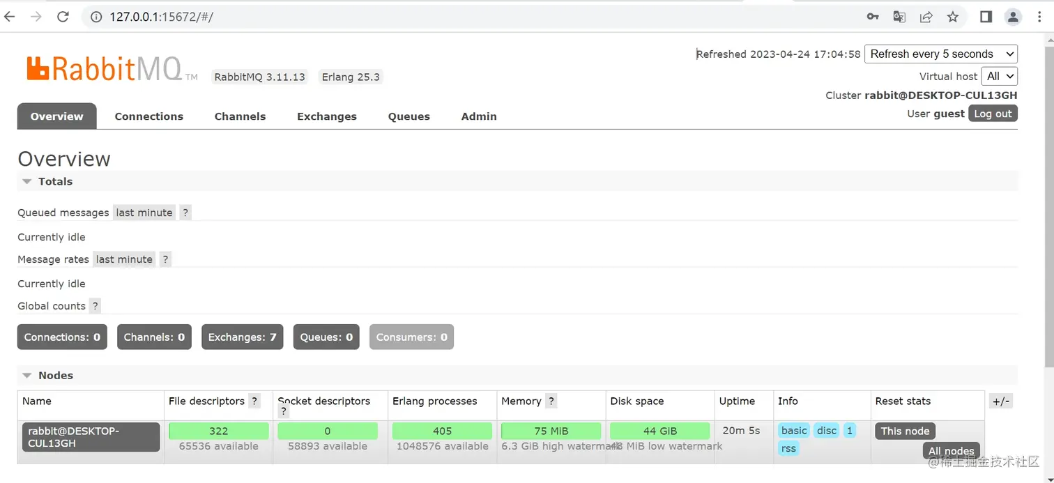 访问地址http://127.0.0.1:15672/;初始账号和密码guest/guest。