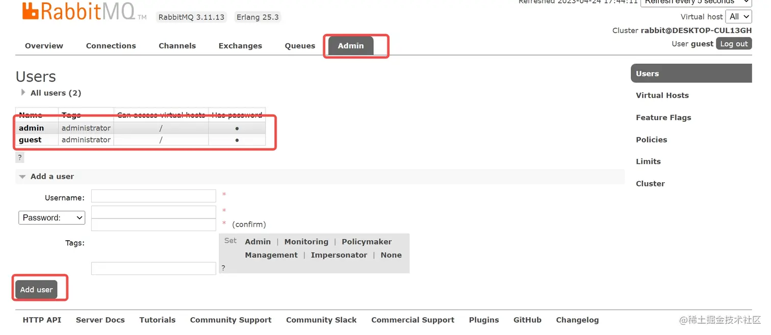 在RabbitMQ管理后台创建admin用户;可以使用默认的guest用户。