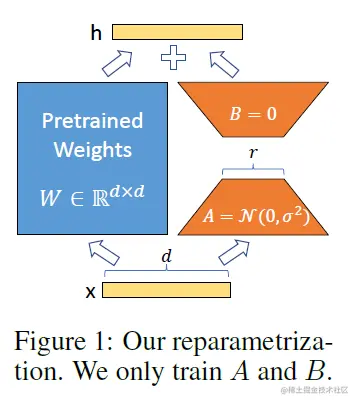 LoRA的原理比较简单,原始全量微调其实就是在原始模型参数上通过微调加入增量,那我们可以通过冻结原始参数,并且把增量部分通过低秩分解方式进一步降低参数量级,原始参数的维度是, 则低秩分解后的参数量级是,因为这里的r<<d,因此可以起到大幅降低微调参数量级的效果,如下图