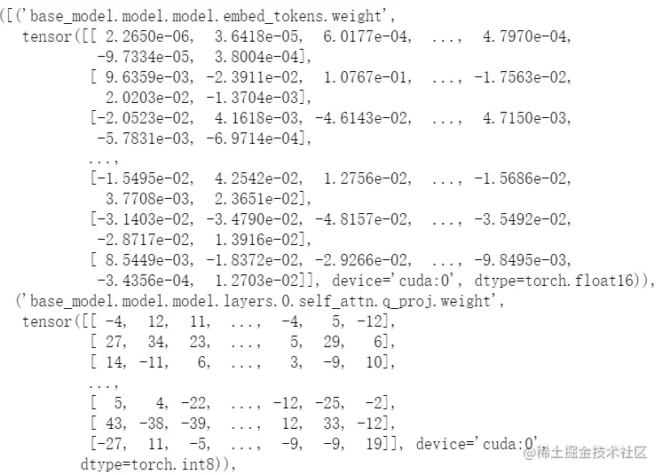 模型量化本质是对浮点参数进行压缩的同时,降低压缩带来的误差。 8-bit quantization是把原始FP32(4字节)压缩到Int8(1字节)也就是1/4的显存占用。如上加载后会发现除lora层外的多数层被转化成int类型如下