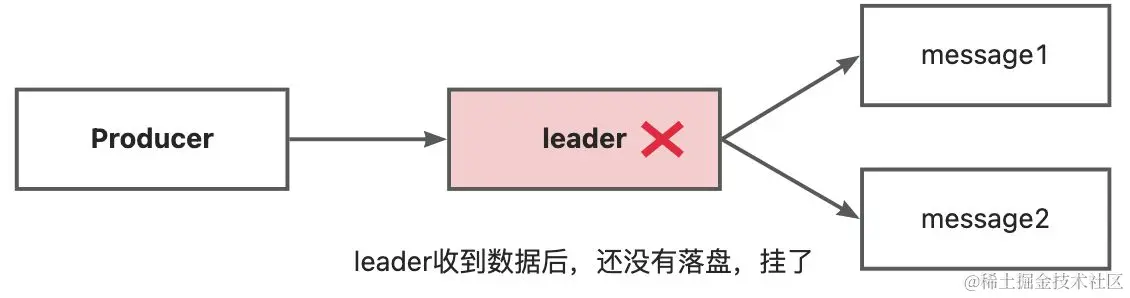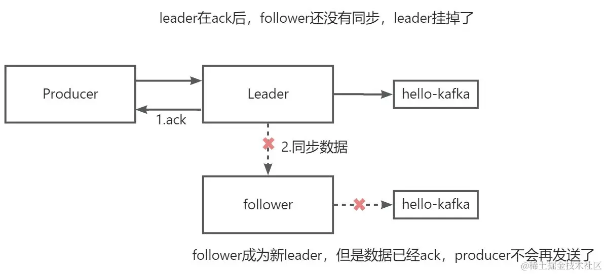 (leader接收到数据,落盘并响应,但是follower还没有同步数据并落盘,如果leader挂掉后,重新选出一个leader,但新leader没有对应数据)