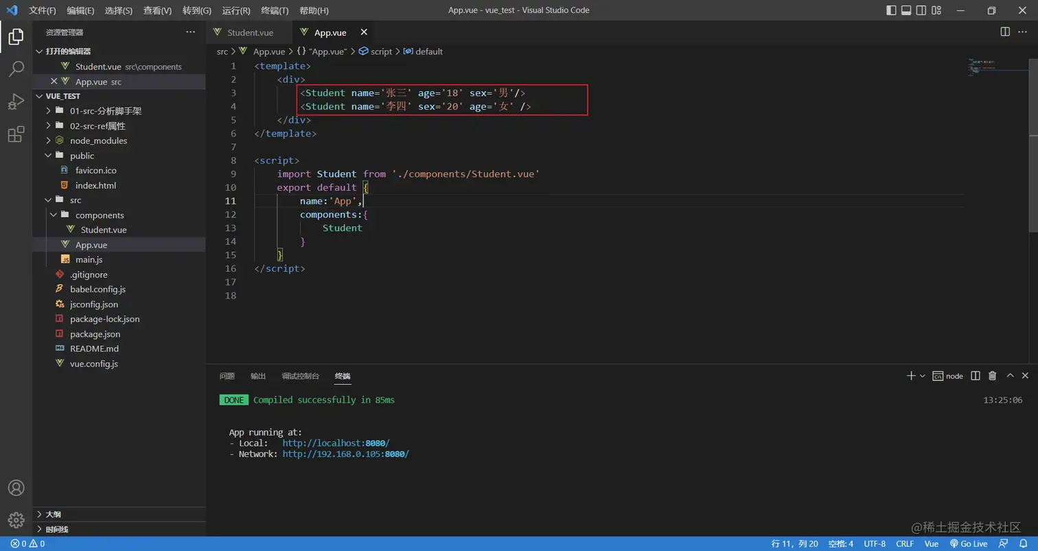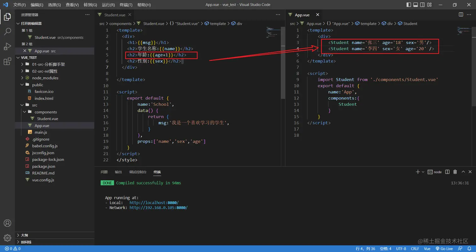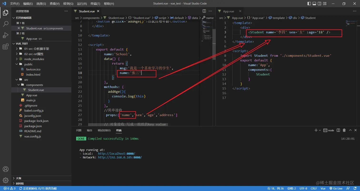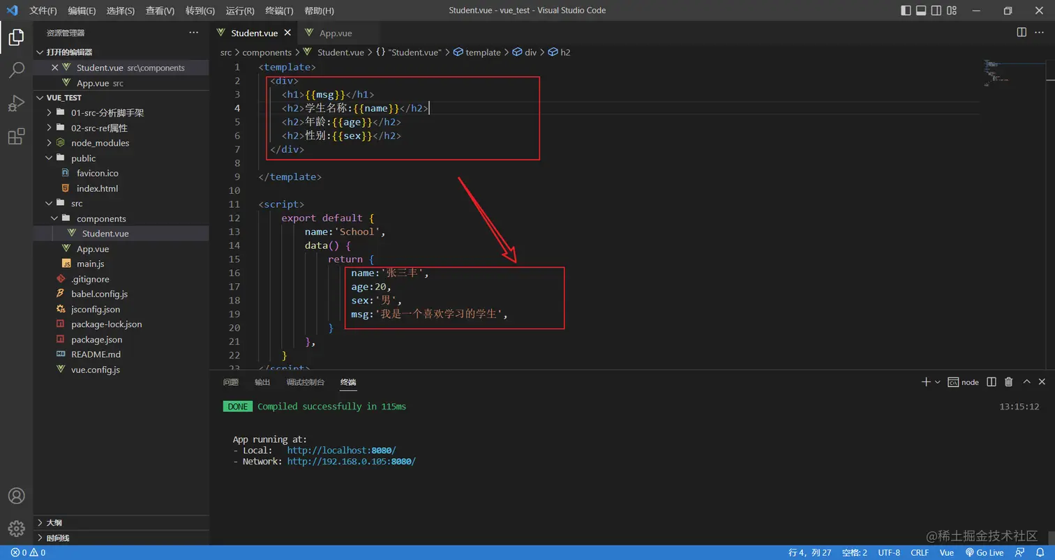 这里简单写了一个student组件,内容如下,这时候如果别人想用这个student组件,但是想要的数据不是这样的,比如学生姓名叫李四,这时候就需要修改组件模板了