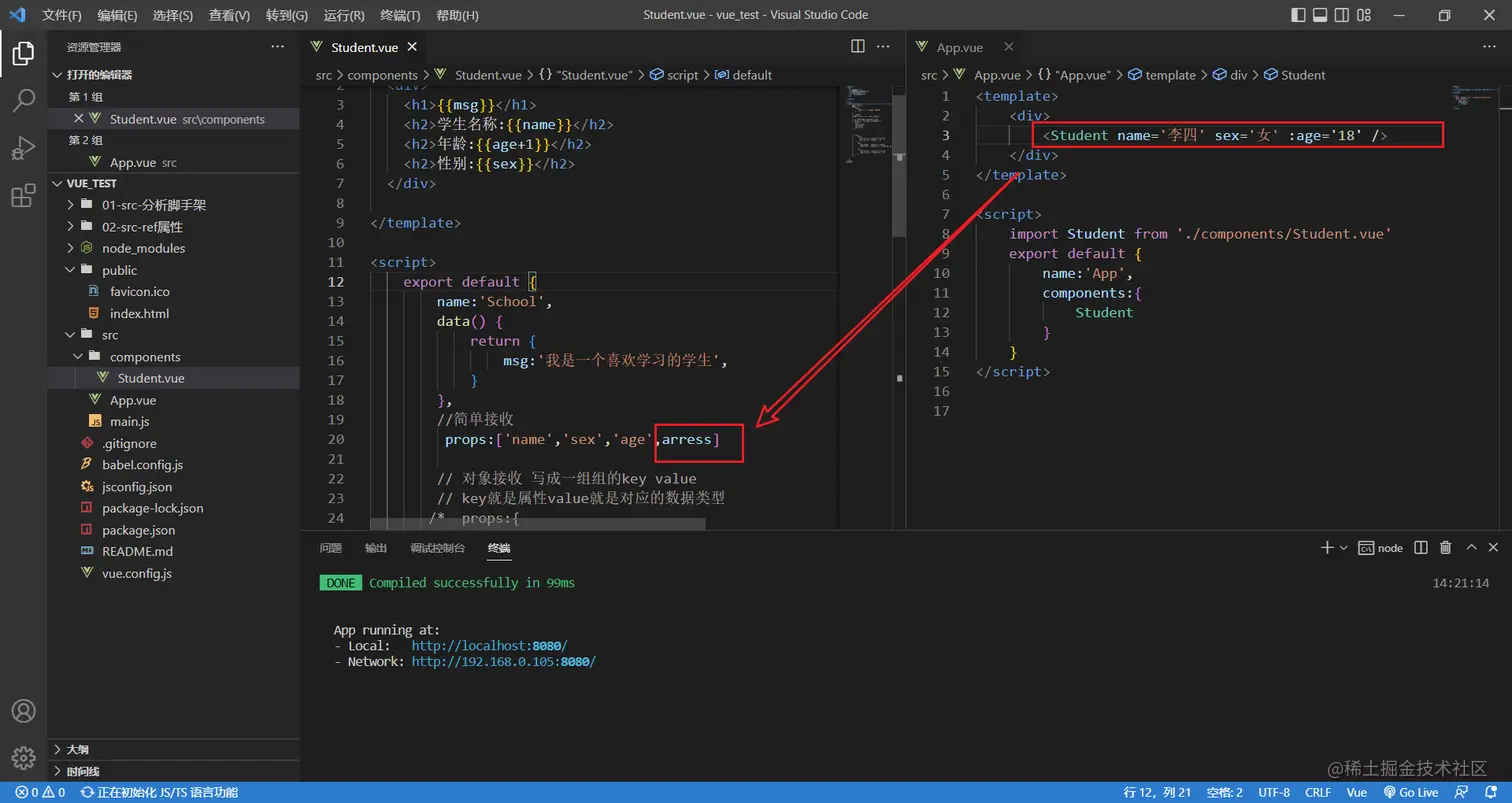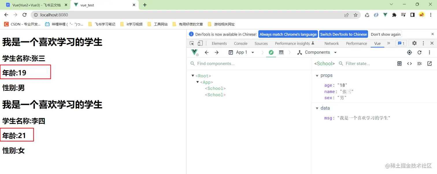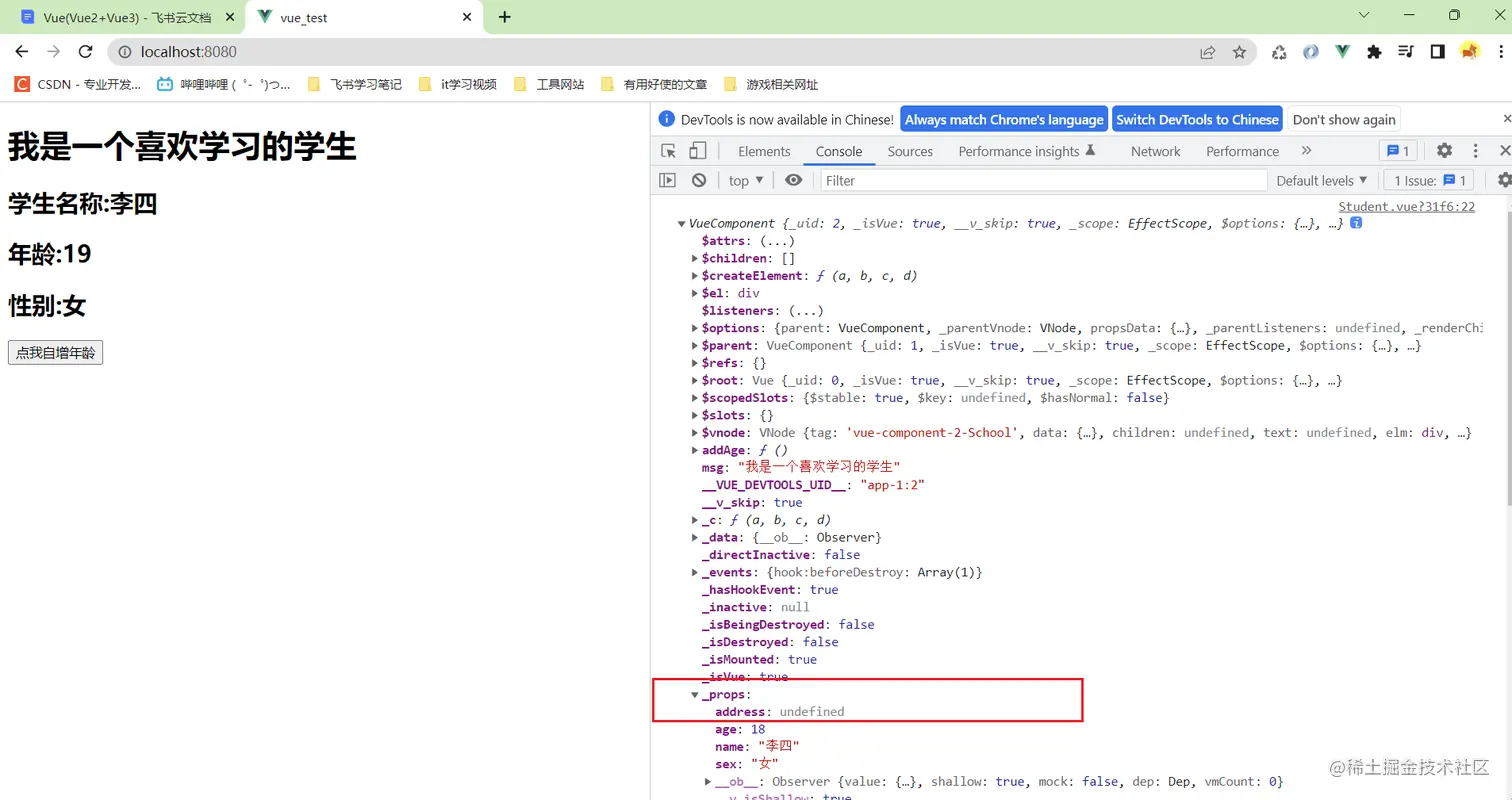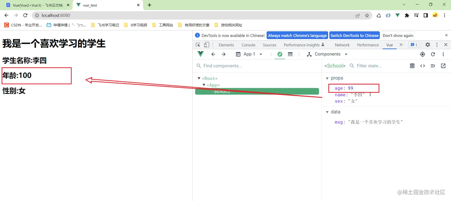 如果不传age,默认值99也到位了并且会自动加入:(v-bind)