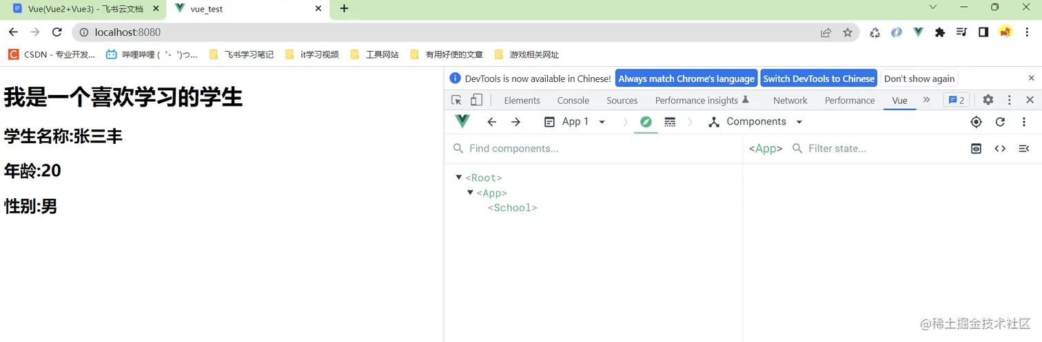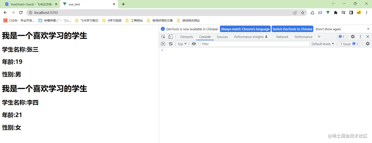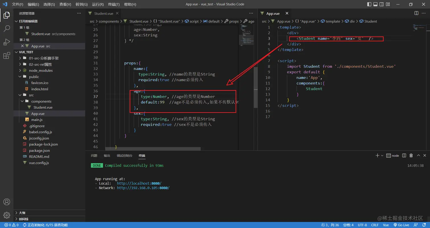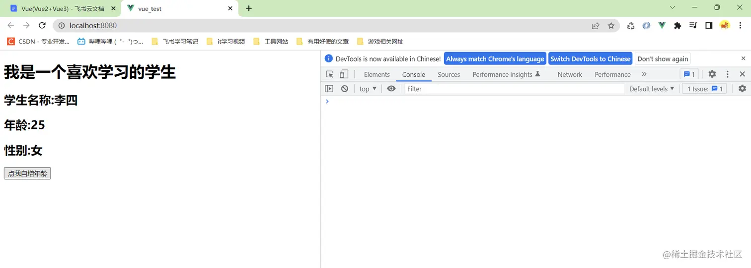 如果不传age,默认值99也到位了并且会自动加入:(v-bind)