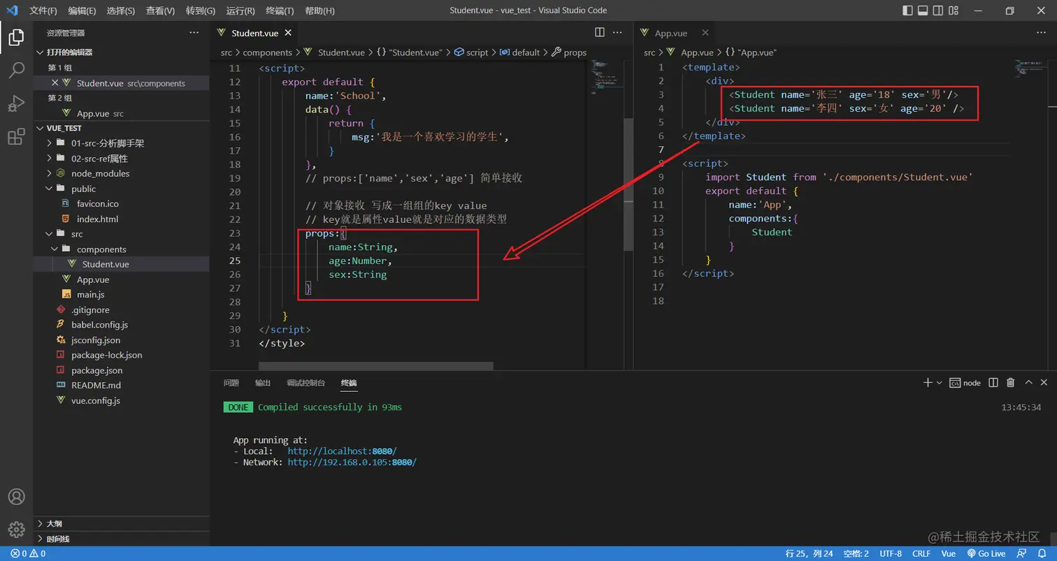 props对象接收:把props写成对象的格式,里面是一组组的key value ,key就是属性value就是对应的数据类型