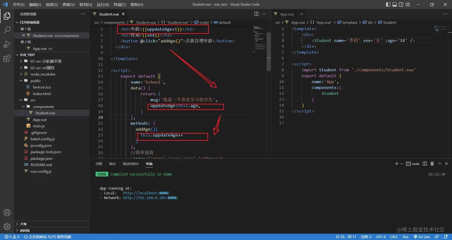 这时候可以在组件传入age参数的时候,给age加一个:,也就是v-bind的缩写,表示以表达式的方式处理