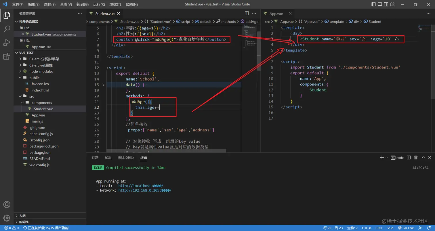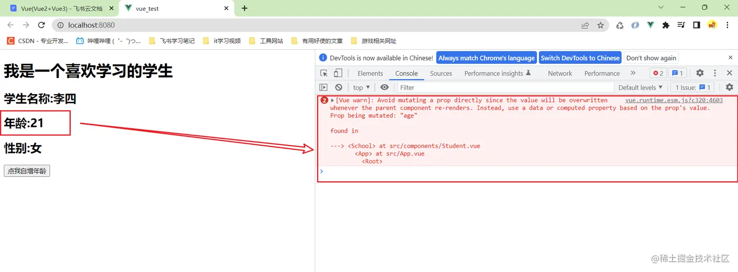 虽然可以使得年龄自增,但是也会报错,vue不建议直接修改props里面的值