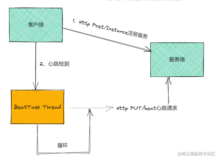 BeatTask 线程通过 HTTP PUT /instance/beat 向 Nacos 发送心跳请求,如果当前实例在服务器上不存在,则重新注册实例,否则等待执行下一次心跳
