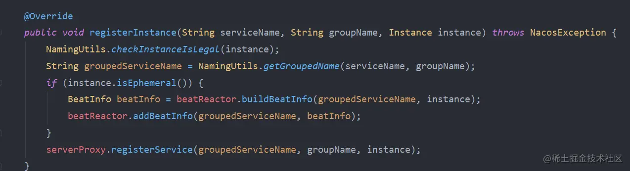 NacosNamingService 中的 registerInstance 方法用于向Nacos注册实例,Nacos 中的实例分为临时和永久2种类型,注册前先判断实例是否是临时实例(默认都是临时实例),如果是Instance是临时实例,则创建一个 BeatTask 心跳线程定期调用 HTTP PUT /instance/beat 向 Nacos 服务器发送心跳,然后调用 HTTP POST /instance 向 Nacos 服务器注册实例。
