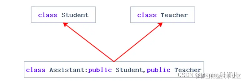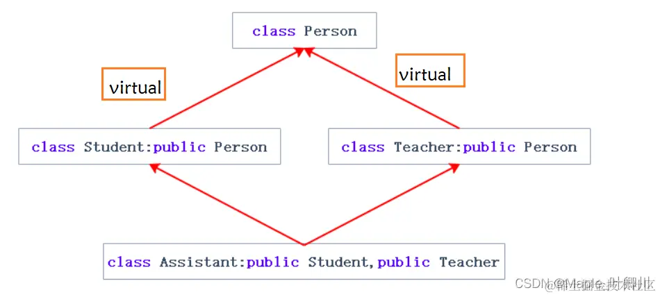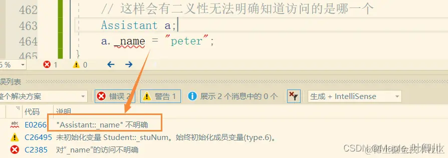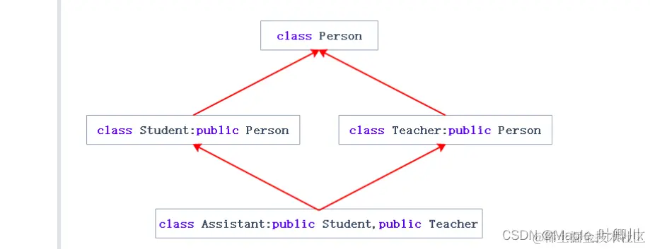 Assistant 对象是多继承的 Student 和 Teacher,而 Student 和 Teacher 当中都继承了 Person,因此 Student 和 Teacher 当中都有 _name 成员,若是直接访问 Assistant 对象的 _name 成员会出现访问不明确的报错