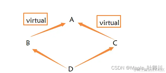 菱形虚拟继承在继承方式前加 virtual 即可,注意加 virtual 的位置