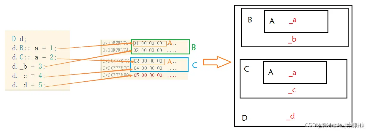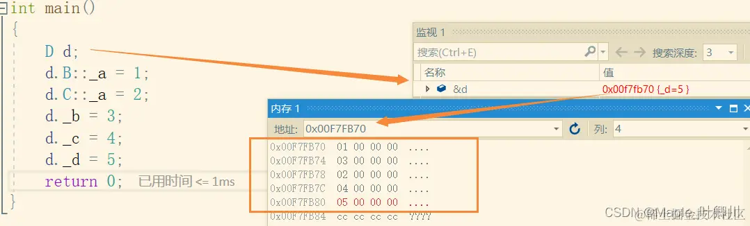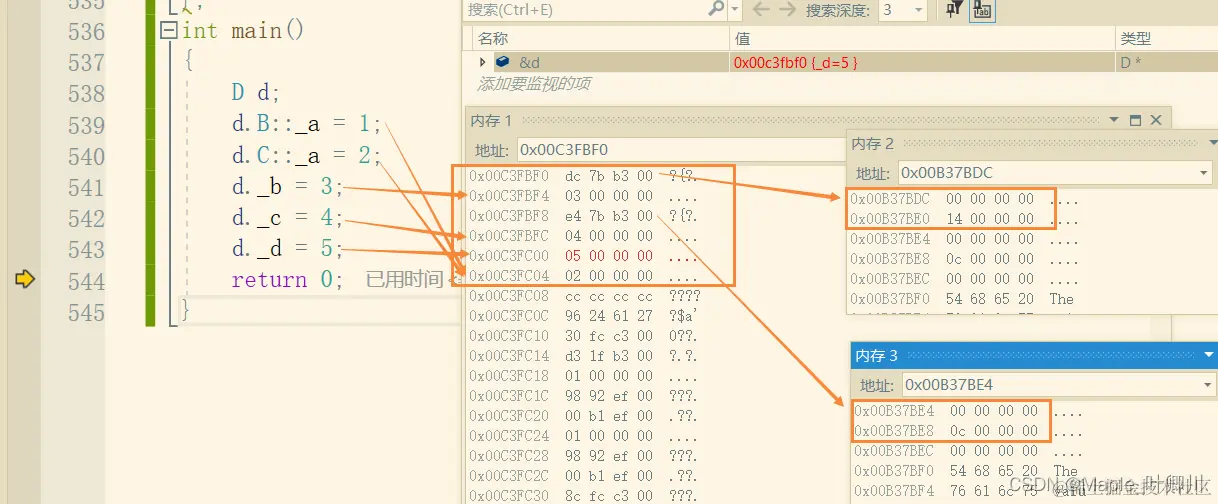 从内存窗口可以看出 d对象的分布情况 ,D类对象 d当中各个成员在内存当中的分布情况如下:
