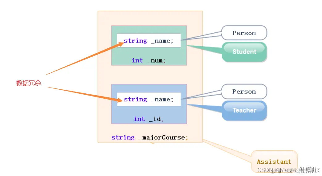 对于此,可以显示指定访问 Assistant 哪个父类的 _name 成员,二义性解决了,但是数据冗余无法解决