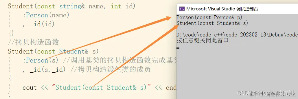 要让一个子类进行继承父类,需要在子类的类的类名后加上冒号,并跟上继承方式和父类类名即可,比如上面的子类 Student