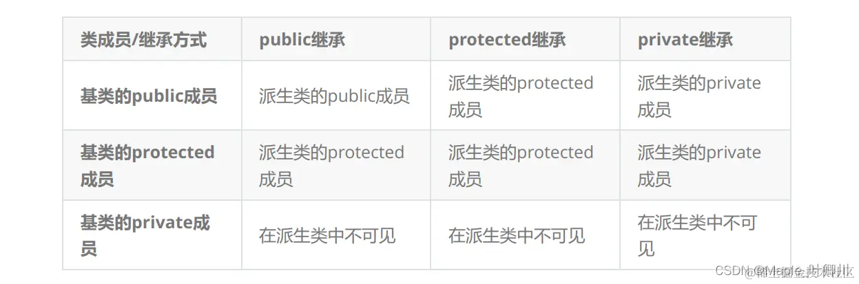 基类当中被不同访问限定符修饰的成员,以不同的继承方式继承到派生类当中后,该成员最终在派生类当中的访问方式将会发生变化,如下图
