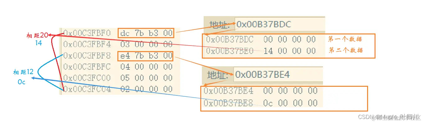 虚基表中包含两个数据,第一个数据(全为0的)是为多态的虚表预留的存偏移量的位置(暂时不理会),第二个数据就是当前类对象位置距离公共虚基类的偏移量(由于VS是小端,地址需要成对的倒着读,比如 14 00 00 00 ,读的话就是0x00 00 00 14,十进制就是20)