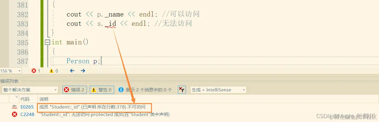 (2)因此,基类的 private 成员在派生类中是不能被访问的,如果基类成员不想在类外直接被访问,但需要在派生类中能访问,就需要定义为 protected,由此可以看出,protected 限定符是因继承才出现的