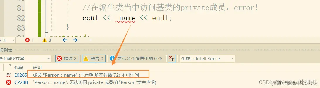 (1)基类 private 成员在派生类中无论以什么方式继承都是不可见的。这里的**不可见是指基类的私有成员还是被继承到了派生类对象中,但是语法上限制派生类对象不管在类里面还是类外面都不能去访问它,**如果进行访问会直接报错