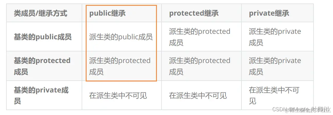 (3)实际上面的表格我们进行一下总结会发现,基类的私有成员在子类都是不可见。基类的其他成员在子类的访问方式 == Min(成员在基类的访问限定符,继承方式),public > protected> private