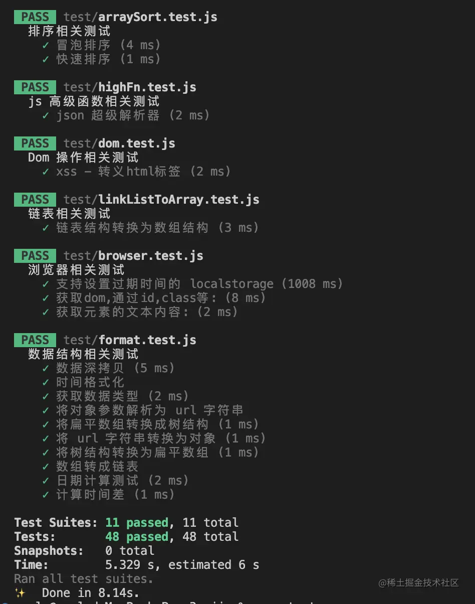 整个测试一共花了8.14s, 测试全部通过, 各位小伙伴们可以放松食用.