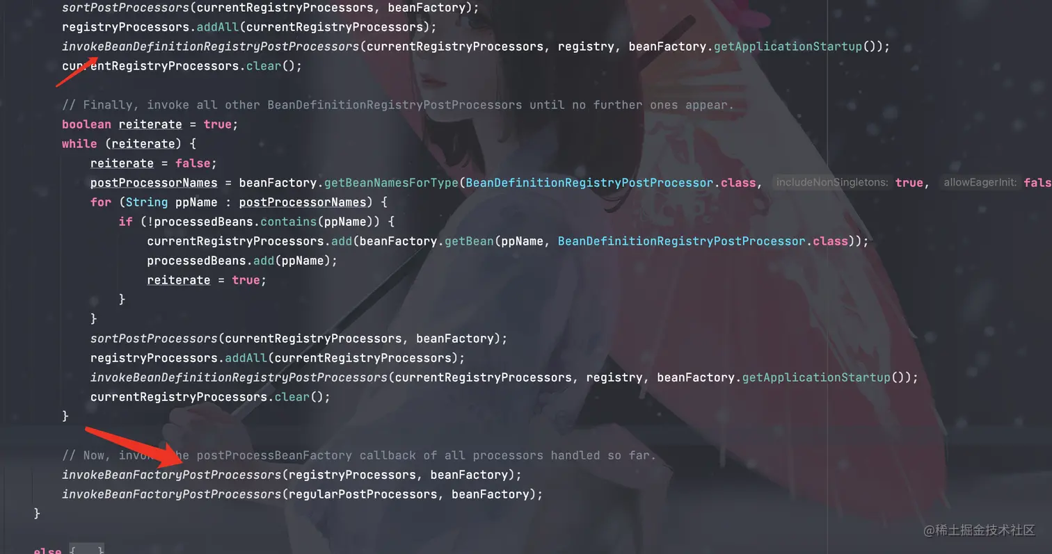 - 其接口方法是:void postProcessBeanFactory(ConfigurableListableBeanFactory beanFactory) throws BeansException;