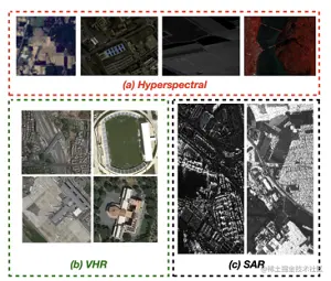 本文介绍的是可见光遥感图像上的目标检测,首先我们来了解一下什么是遥感图像,遥感图像,也称为高分辨率遥感图像(Very High-resolution Imagery),但是在遥感图像的领域内,除了可见光遥感图像之外,还有其他两种遥感图像,一种是高光谱遥感图像(Hyperspectral Imagery),一种是雷达遥感图像(Synthetic Aperture Radar Imagery),其分类依据是根据成像的介质不同来进行分类的。我们主要用到的是高分辨率遥感图像,接下来说以下可见光遥感图像的成像优点。第一,其成像方式更符合我们人类眼睛成像方式;第二,其分辨率超高,能以更精细的分辨率产生地球表面的全色多光谱图像;第三,基于成像特点,对于进行图像分析(检测、分割等)十分友好。用一张图片直观的了解一下三种遥感图像的区别: