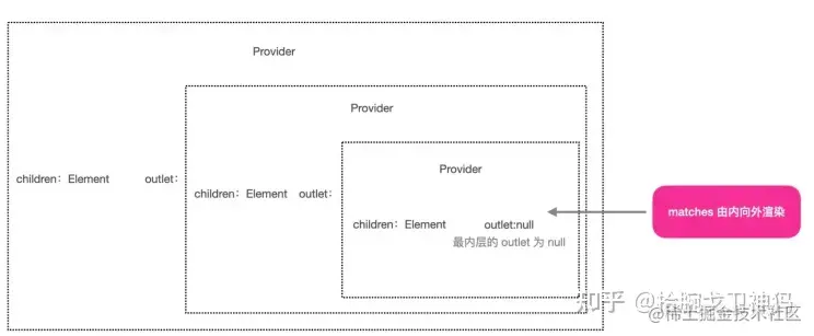 - useRoutes在渲染阶段会将matches数组渲染为一个聚合的React Element,该元素整体是许多RouteContext.Provider的嵌套,从外到内依次是【父 => 子 => 孙子】这样的关系,每个Provider包含两个值,与该级别对应的matches数组(最后的元素是该级别的route自身)与outlet元素,outlet元素就是嵌套RouteContext.Provider 存放的地方,每个RouteContext.Provider的children就是route的element属性;