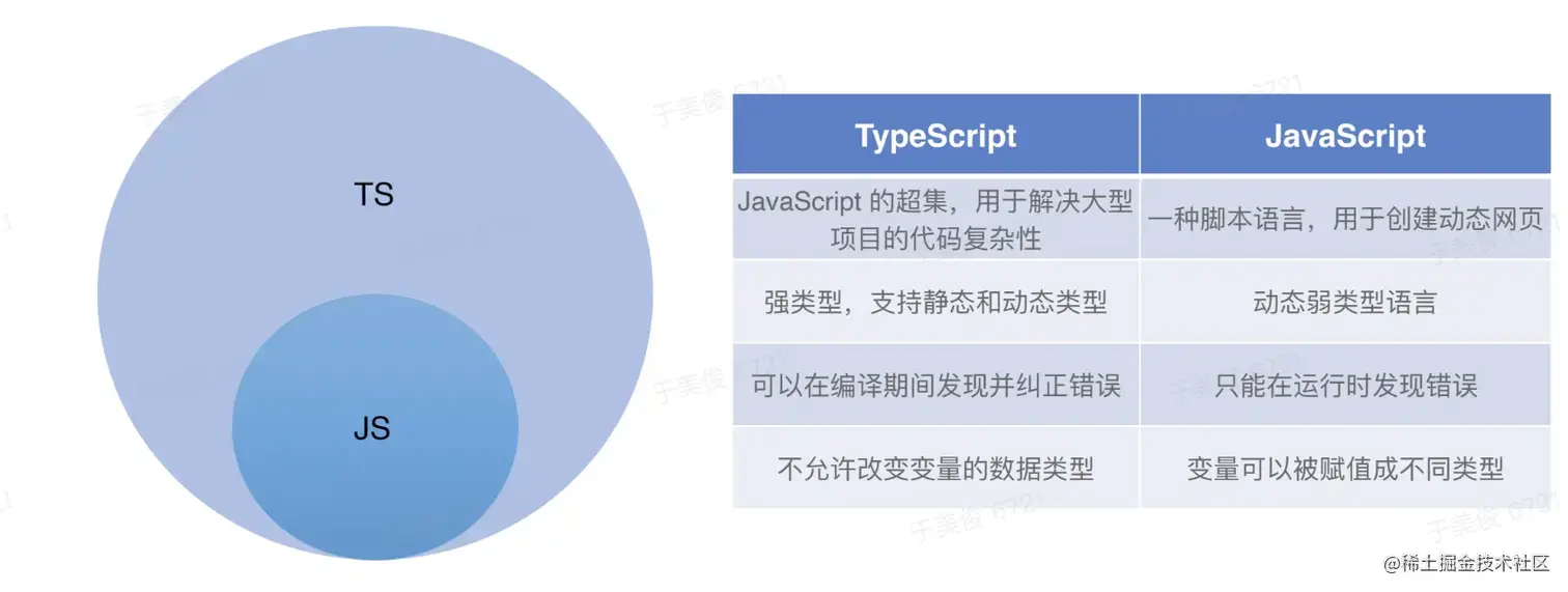 TypeScript 是 JavaScript 的超集,它包含了 JavaScript 的所有元素,可以载入 JavaScript 代码运行,并扩展了 JavaScript 的语法。TypeScript 增加了静态类型、类、模块、接口和类型注解等特性。TypeScript 代码需要通过编译器编译为 JavaScript,然后再交由 JavaScript 解析器执行。